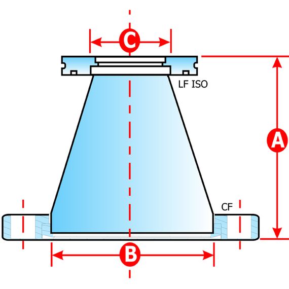 These ISO LF NW to Conical Conflat adapter vacuum fittings follow International Standards Organization (ISO) and Conflat standards. They have a flange sizes of ISO LF NW-63 to CF Conflat 3 3/8 inch. ISO flanged vacuum fittings are commonly used to build process vacuum plumbing and systems for industrial applications. The fittings are quick to assemble using double claw clamps and a centering ring (please see top right figure - click to enlarge). The Viton® centering ring contains a rubber/elastomeric o-ring. The ISO standard sizes for large flanges are NW-63, NW-80, NW-100, NW-160, NW-200, NW-250, NW-320, NW-400, NW-500, NW-630. These vacuum flages are made of corrosive resistant stainless steel. Conflat® is a registered trademark of Varian Corporation.