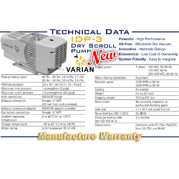 The Agilent Varian IDP-3 dry scroll vacuum pumps is a compact, high performance dry pump that provides affordable oil-free vacuum and easy system integration, and is suitable for a wide variety of applications. The Varian IDP-3 employs an innovative hermetic design in which the motor and bearings are outside the vacuum space, allowing full isolation of all pumped gases. Delivering a robust pumping speed of 60 l/m (2.1 CFM) and a very low base pressure of less than 2.5x10-1 Torr. The Varian IDP-3 provides all the advantages of Varian’s patented scroll pump technology in a compact, lightweight, cost-effective package. These new Varian IDP-3 dry oil-free scroll vacuum pumps (Product Number IDP3D01) operate on 1 Ph, 24 VDC. An Instruction Manual and Brochure PDF on the IDP3 Scroll Pumps can be downloaded, by scrolling down to (AVAILABLE DOWNLOADS)