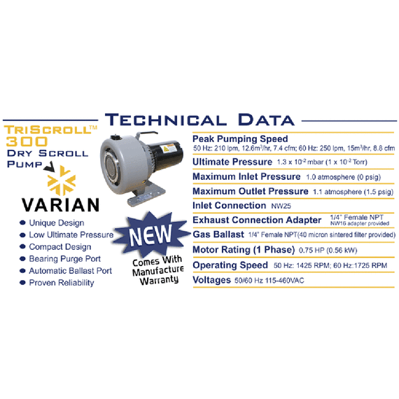 This Agilent Varian 300 Triscroll dry scroll vacuum pump is designed for high reliability with a 8.8 CFM pumping speed and an ultimate pressure of 1x10-2 Torr. The Triscroll pumps produces oil-free vacuum with the unique patented TriScroll technology. These Agilent Varian Triscoll 300 dry scroll vacuum pumps feature proven reliability and durability leading to superior cost of ownership and consistent performance. Applications include: Scanning Electron Microscopes, Primary backing pump for turbo systems, General purpose laboratory applications, Beam Lines, Drying Ovens, Load Locks and Transfer Chambers, Cryogenics, Manufacturing/Glove Box Enclosers, Leak Detection. These Agilent Varian Triscroll 300 dry scroll vacuum pumps have product number PTS03001UNIV, operate on 1 Ph, 100-120 or 208-230 VAC, and are brand new under full warranty.