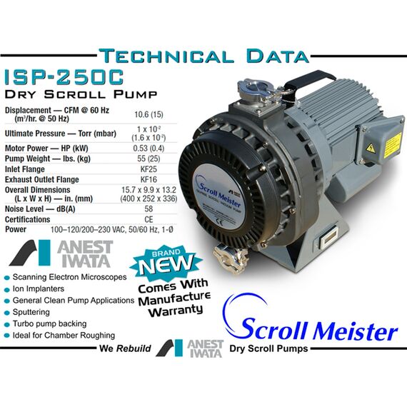 The Anest Iwata ISP-250C is economical and inexpensive to operate. Offers high performance, compact design and very light. Little routine maintenance, no oil changes, filters or foreline traps to replace. Excellent alternative to oil sealed rotary vane pumps. These Anest Iwata ISP-250C oil-free dry scroll pumps, operate on 3-phase, 200-230/380-480 VAC, & 50/60 Hz, being set to 480 VAC. Displacement for this Anest Iwata ISP-250C is 10.6 CFM at 60 Hz. This is pump has a 3-Phase motor. The part number ISP-250C-TV specifiies Three-Phase (T) with vertical oriented intake flange (V). The operating instructions manual is available for down in PDF format below.