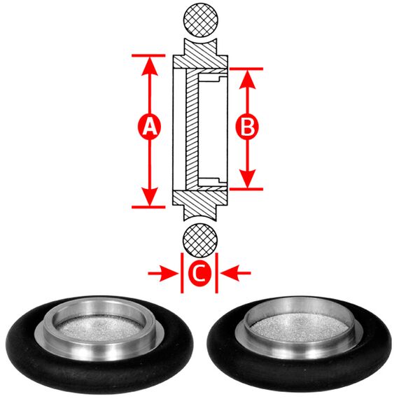 These KF-16 Centering Rings with screen vacuum fittings follow ISO-KF standards and have a flange size of NW-16. These centering rings with screen mesh are useful in many situations in which a vacuum system or instrument needs to be protected from contamination by particulate generated from outside the system or from within. They are commonly used to build foreline vacuum plumbing and process systems. They are often called quick flange fittings because they are quick to assemble. A circumferential clamp and centering ring form the vacuum seal between the connecting flanges (please see top right figure - click to enlarge). The centering ring contains a rubber elastomer o-ring. The standard sizes for quick flange fittings are KF-10, KF-16, KF-25, KF-40, and KF-50 with flange sizes NW-10, NW-16, NW-25, NW-40, and NW-50, respectively. They are made of corrosive resistant stainless steel with Viton® O-Ring. Viton® is well known for its excellent resistance to heat (400°F/200°C) and to aggressive fuels and chemicals. Viton® is a registered trademark of DuPont Performance Elastomers.
