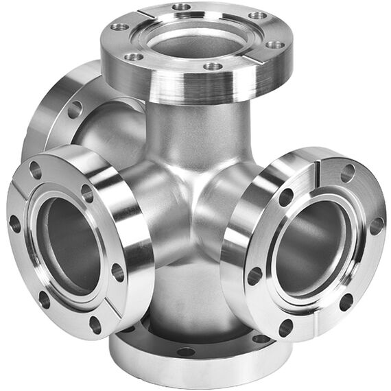 These 5-way cross vacuum fittings have two rotatable and two fixed 2-3/4 inch conflat (CF) flanges. ConFlat (CF) flanges are used for ultra-high vacuum applications. These fittings use a copper gasket and knife-edge flanges to achieve the high vacuum seal and can operate down to 10-13 torr (10-11 Pa) and can be heated to 450 °C for bake-out. North American flange sizes are given by flange outer diameter in inches: 1-1/3 ("mini conflat"), 2¾, 4½, 6, 8, 10, 12, 13¼, 14 and 16½. In Europe and Asia, sizes are given by tube inner diameter in millimeters: DN16, DN40, DN63, DN100, DN160, DN200, DN250. These vacuum fittings are made of corrosive resistant stainless steel.