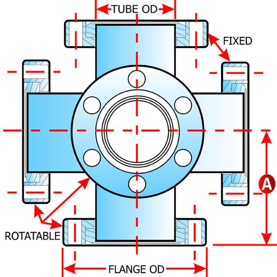 These 6-way cross vacuum fittings have three rotatable and three fixed 1-1/3 inch conflat (CF) flanges. ConFlat (CF) flanges are used for ultra-high vacuum applications. These fittings use a copper gasket and knife-edge flanges to achieve the high vacuum seal and can operate down to 10-13 torr (10-11 Pa) and can be heated to 450 °C for bake-out. North American flange sizes are given by flange outer diameter in inches: 1-1/3 ("mini conflat"), 2¾, 4½, 6, 8, 10, 12, 13¼, 14 and 16½. In Europe and Asia, sizes are given by tube inner diameter in millimeters: DN16, DN40, DN63, DN100, DN160, DN200, DN250. These vacuum fittings are made of corrosive resistant stainless steel.