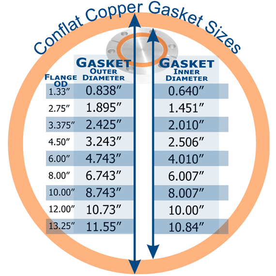 These conflat copper conflat gaskets fit a conflat flange size of 13-1/4 inches. ConFlat (CF) flanges are used for ultra-high vacuum applications. These fittings use a copper gasket and knife-edge flanges to achieve the high vacuum seal and can operate down to 10-13 torr (10-11 Pa) and can be heated to 450°C for bake-out. North American flange sizes are given by flange outer diameter in inches: 1-1/3 ("mini conflat"), 2¾, 4½, 6, 8, 10, 12, 13¼, 14 and 16½, in Europe and Asia, sizes are given by tube inner diameter in millimeters: DN16, DN40, DN63, DN100, DN160, DN200, DN250. These vacuum fittings are made of corrosive resistant stainless steel.