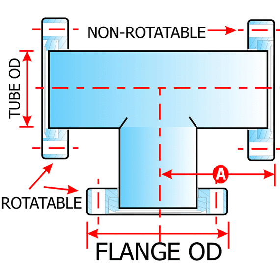 These tee vacuum fittings have two rotatable and one fixed 4-1/2 inch conflat (CF) flanges. ConFlat (CF) flanges are used for ultra-high vacuum applications. These fittings use a copper gasket and knife-edge flanges to achieve the high vacuum seal and can operate down to 10-13 torr (10-11 Pa) and can be heated to 450 °C for bake-out. North American flange sizes are given by flange outer diameter in inches: 1-1/3 ("mini conflat"), 2¾, 4½, 6, 8, 10, 12, 13¼, 14 and 16½. In Europe and Asia, sizes are given by tube inner diameter in millimeters: DN16, DN40, DN63, DN100, DN160, DN200, DN250. These vacuum fittings are made of corrosive resistant stainless steel.
