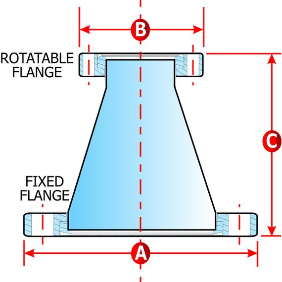 These reducer nipple conical vacuum fittings have one rotatable and one fixed 3-3/8 and 2-1/8 inch conflat (CF) flanges. ConFlat (CF) flanges are used for ultra-high vacuum applications. These fittings use a copper gasket and knife-edge flanges to achieve the high vacuum seal and can operate down to 10-13 torr (10-11 Pa) and can be heated to 450 °C for bake-out. North American flange sizes are given by flange outer diameter in inches: 1-1/3 ("mini conflat"), 2¾, 4½, 6, 8, 10, 12, 13¼, 14 and 16½. In Europe and Asia, sizes are given by tube inner diameter in millimeters: DN16, DN40, DN63, DN100, DN160, DN200, DN250. These vacuum fittings are made of corrosive resistant stainless steel.