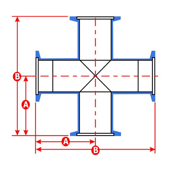 These KF-25 4-way cross vacuum fittings follow ISO-KF standards and have a flange size of NW-25. They are commonly used to build foreline vacuum plumbing and process systems. They are often called quick flange fittings because they are quick to assemble. A circumferential clamp and centering ring form the vacuum seal between the connecting flanges (please see top right figure - click to enlarge). The centering ring contains a rubber elastomer o-ring. The standard sizes for quick flange fittings are KF-10, KF-16, KF-25, KF-40, and KF-50 with flange sizes NW-10, NW-16, NW-25, NW-40, and NW-50, respectively. They are made of corrosive resistant stainless steel.