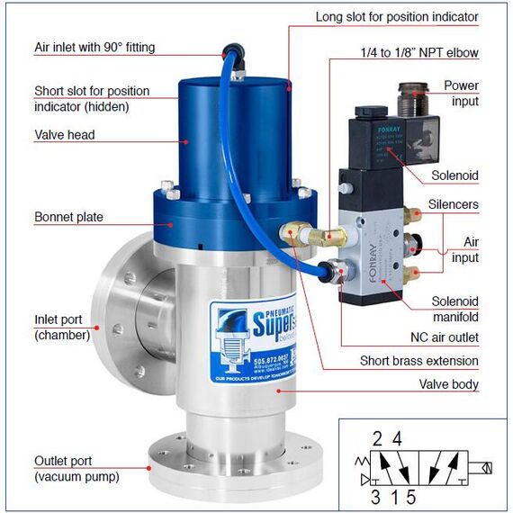 Medium-sized Super-Seal valves require air to both open and to close. They do not have a spring return and therefore do not automatically close. Low volume, dry, compressed air in the range of 60-to-80 psi is needed. When energized, the solenoid directs air flow through the solenoid's manifold into the valve's bonnet, opening the valve. When the solenoid is de-energized, air flow is redirected to the top of the valve head, closing the valve. Because they do not have automatic spring closure, medium Super-Seal valves cannot provide failure protection to preserve chamber vacuum in case of loss of power or air supply.