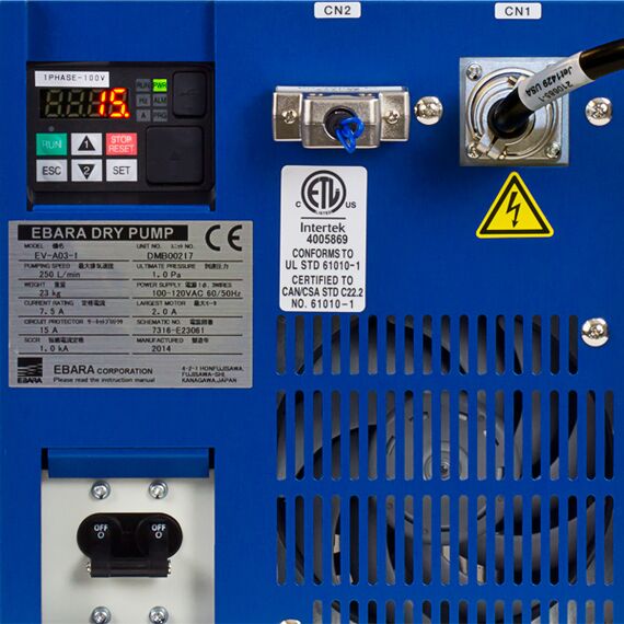 The Ebara EV-A dry rotary lobe vacuum pumps include an operation panel and LED display to adjust the pump conditions and control pump settings, such as, run frequency, current, run hours, and error monitoring. These pump motors include a Variable Frequency Drive (VFD) that starts the pump slowly from rest to full speed, reducing noise and vibration, while providing a low start up current. The pumps also include an I/O connector D-sub port which provides dry contactor functions like remote start and alarm status monitoring.
