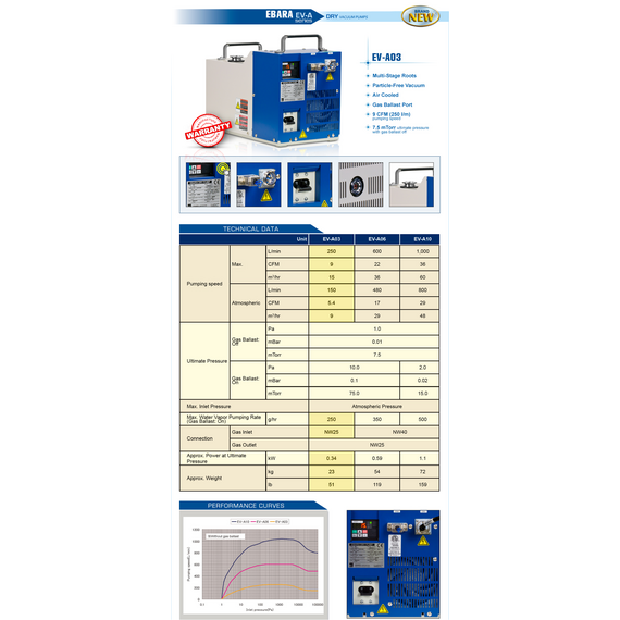The Ebara EV-A 03 series dry vacuum pumps are simple to use, simply plug them in and turn them on (it's that simple). They can be ordered to operate on 1-phase 115, 1-phase 208 VAC, or 3-phase 208 VAC, the current part number being sold here, 202549 is for the 1-phase 200-240 VAC pump. The Ebara EV-A pumps can operate continuously at atmospheric pressure without over heating or locking up. The Ebara EV-A vacuum pumps are compact and are quite during operation <56dB(A). Optional rolling casters are available for easy moving about the facility. Please see the additional information in the user's manual and products brochure downloads below.