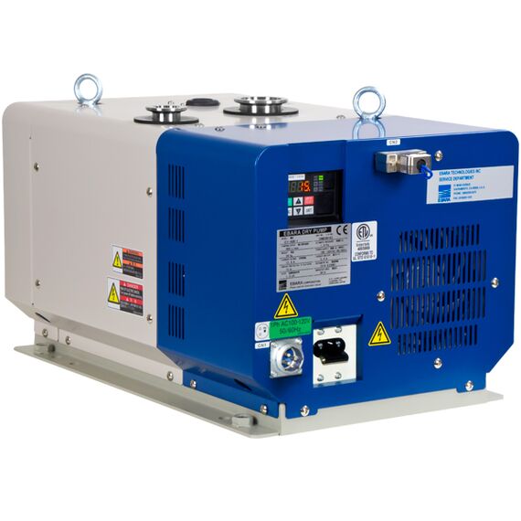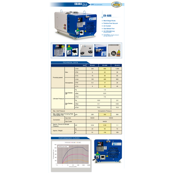 The Ebara EV-A 06 series dry vacuum pumps are simple to use, simply plug them in and turn them on (it's that simple). They can be ordered to operate on 1-phase 115, 1-phase 208 VAC, or 3-phase 208 VAC, the current part number being sold here, 202550 is for the 1-phase 200-240 VAC pump. The Ebara EV-A pumps can operate continuously at atmospheric pressure without over heating or locking up. The Ebara EV-A vacuum pumps are compact and are quite during operation <57dB(A). Optional rolling casters are available for easy moving about the facility. Please see the additional information in the user's manual and products brochure downloads below.