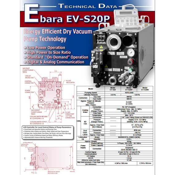- Benefits and Features of the Ebara EV-S20P series dry roots pumps.