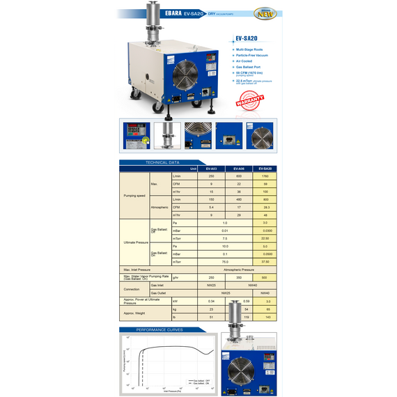 The Ebara EV-SA30 series dry vacuum pumps are simple to use, simply plug them in and turn them on (it's that simple). They can be ordered to operate on 1-phase 208 VAC or 3-phase 208 VAC, the current part number being sold here, 202653 is for the 1-phase 208 VAC pump. The Ebara EV-SA pumps can operate continuously at atmospheric pressure without over heating or locking up. The Ebara EV-SA vacuum pumps are compact and are quite during operation. They include rolling casters for easy moving about the facility. Please see the additional information in the user's manual and products brochure downloads below.