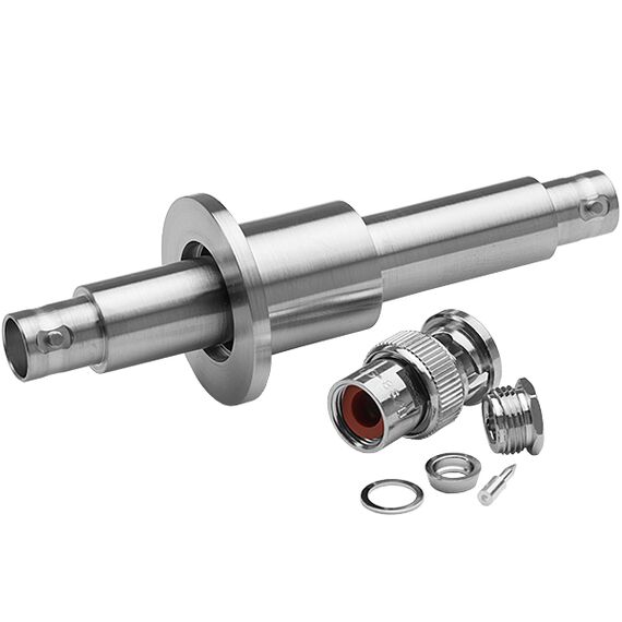 Bayonet Naval Connector (BNC) RF coaxial feedthroughs are typically used for connecting radio frequency electronic equipment with miniature-to-subminiature coaxial cable. BNC series are commonly used for low power transmission and are rated to 500 Volts DC. This connector is weldable and has a 1.18 in. diameter KF16, stainless steel adapter.