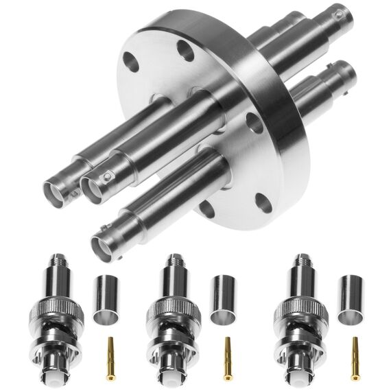 Safe High Voltage Connector (SHV) RF coaxial feedthroughs are typically used for connecting radio frequency electronic equipment with miniature-to-subminiature coaxial cable. BNC series are commonly used for low power transmission and are rated to 500 Volts DC. This feedthrough has 3 coaxial connectors and a Conflat 2.75 (2-3/4") flange, through holes, and rated for Ultra High Vacuum (UHV). The feedthrough includes three (3) air-side connectors.