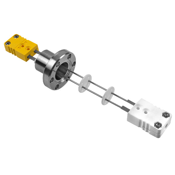 Thermocouple is the description for electrical feedthroughs that are commonly used for temperature measurement systems. A thermocouple feedthrough does not measure temperature, but rather it is used to conduct the thermocouple’s voltage signal from inside the vacuum system to an external instrumentation device. These feedthroughs use ceramic to metal sealing technology to braze various metals used in thermocouple assemblies to high purity alumina ceramic insulators. Thermocouple feedthroughs are suitable for ultra high vacuum applications. Several mounting options are available, being Weld On, KF, CF, Baseplate and NPT Adapters.