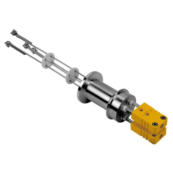 Thermocouple is the description for electrical feedthroughs that are commonly used for temperature measurement systems. A thermocouple feedthrough does not measure temperature, but rather it is used to conduct the thermocouple’s voltage signal from inside the vacuum system to an external instrumentation device. These feedthroughs use ceramic to metal sealing technology to braze various metals used in thermocouple assemblies to high purity alumina ceramic insulators. Thermocouple feedthroughs are suitable for ultra high vacuum applications. Several mounting options are available, being Weld On, KF, CF, Baseplate and NPT Adapters.
