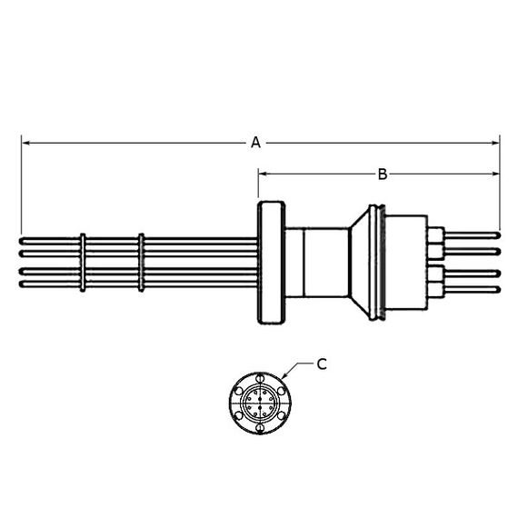 They can contain one or more pairs of wires and have molded plugs, push ons, split connectors and could have lugs or screw connectors on the inside (vacuum) or outside (atmosphere). Things to consider are temperature range, number of temperature locations, sheath material, wire diameter, metal type, and power conductors within the same feedthrough. There are many types of thermocouple feedthroughs made with many different metals having different temperature ranges. When selection is in doubt, please call us.