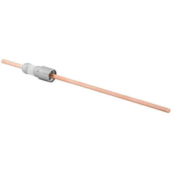 This electrical power feedthrough is a weld-on type for a suitable through-hole on a vacuum flanged fitting. It is a copper electrical feedthrough and conveys high-voltage, high-amperage power into high-vacuum environments for operating heating coils in sputtering, coating and other demanding material evaporation applications or experimentations. These rugged copper power feedthroughs are UHV rated, bakeable to 450° C, have a 0.495 in. diameter insulated sub-assembly and are weldable.