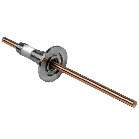 This power feedthrough is a KF25 type vacuum flanged fitting. It is a copper electrical feedthrough and conveys high-voltage, high-amperage power into high-vacuum environments for operating heating coils in sputtering, coating and other demanding material evaporation applications or experiments. These rugged KF25 copper power feedthroughs are UHV rated, and are bakeable to 450° C.