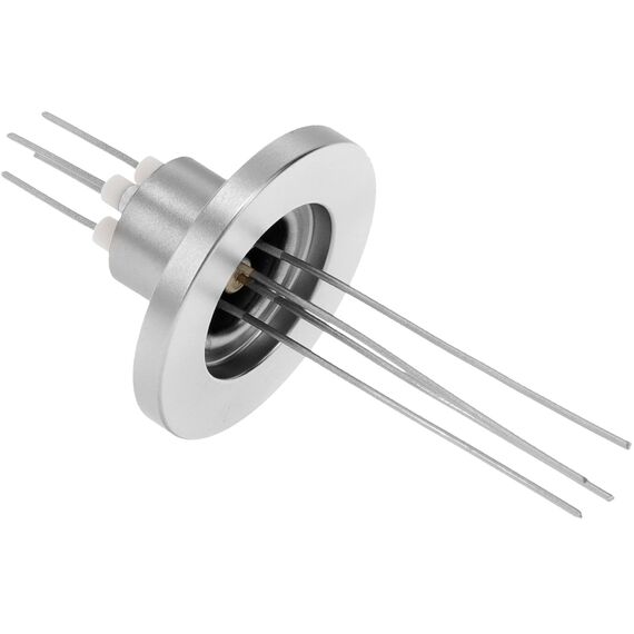 This Ideal Vacuum Power Feedthrough is a KF16 type vacuum flanged fitting. Feedthrough for Low Power Applications, UHV Rated, Bakeable to 450 degrees C. It has Nickel Conductor feedthrough and conveys high-voltage, high-amperage power into high-vacuum environments for operating heating coils in sputtering, coating and other demanding material evaporation applications or experiments. These rugged KF16 copper power feedthroughs are UHV rated, and are bakeable to 450° C.