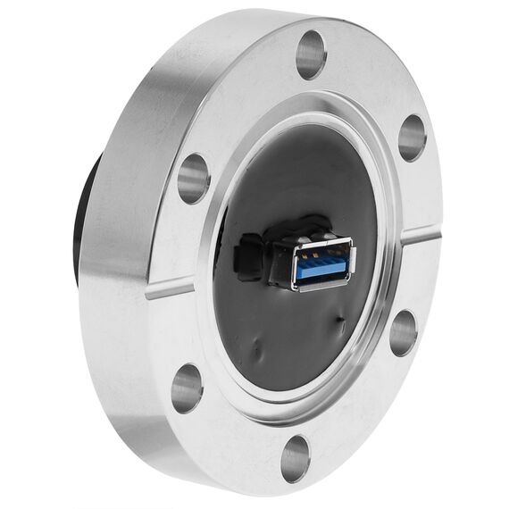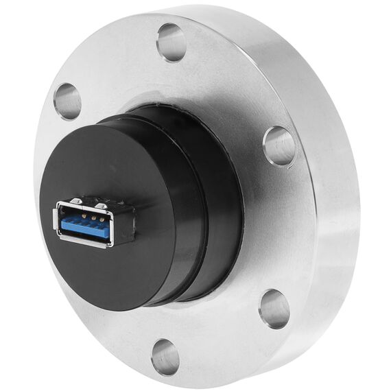 Ideal Vacuum Hermetic USB 3.0 high speed Feedthrough, stainless steel double-ended connector seal, CF 2.75 Flange. Feedthroughs (or vacuum feedthroughs) come in many forms to transfer electrical currents, signals, fluids, gases or mechanical movements from outside the vacuum (air side) to the inside (vacuum side) of a vacuum chamber to equipment within the chamber. The entry point for the feedthrough must be vacuum-sealed via a suitable through hole. The feedthrough can be connected with a CF vacuum flange to the vacuum chamber.
