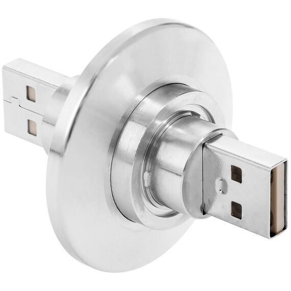 Ideal Vacuum USB Feedthrough Double-Ended, KF25 Flange is UHV Compatible. Feedthroughs (or vacuum feedthroughs) come in many forms to transfer electrical currents, signals, fluids, gases or mechanical movements from outside the vacuum (air side) to the inside (vacuum side) of a vacuum chamber to equipment within the chamber. The entry point for the feedthrough must be vacuum-sealed via a suitable through hole. The feedthrough can be connected to a KF vacuum flange.
