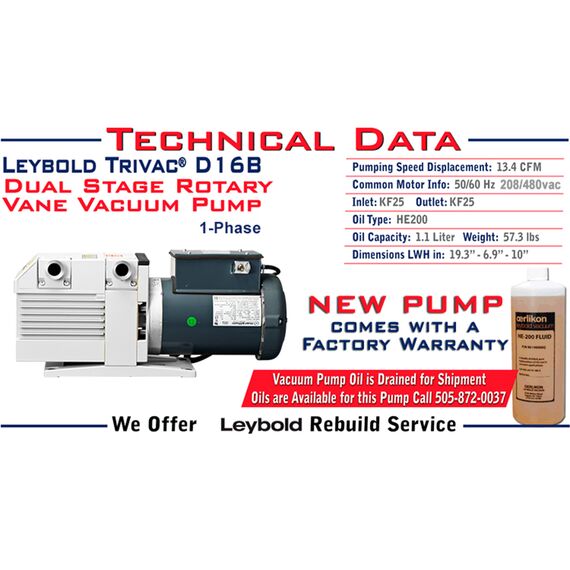 The Leybold D16/D 16 B Trivac are durable vacuum pumps with a superior vapor handling capability. The Leybold D16, D16B dual stage rotary vane mechanical vacuum pumps offer an excellent ultimate pressure of 1x10-4 Torr. These pumps are commonly used for vacuum furnace evacuation, backing turbomolecular pumps, backing diffusion pumps, rotary evaporation, refrigeration system evacuation, epoxy degassing, vacuum sterilization, backing mass spectrometers, freeze drying, vacuum centrifugal applications, vacuum distillation, space research, and other vacuum processes. These Leybold D16/D16B vacuum pumps have a pumping speed displacement of 13.4 CFM. This pump comes with a manufacturer's warranty. Parts, oils and accesories for this pump are located on this website. These Leybold D16B rotary vane vacuum pumps part number 898698 operate on 1-Phase, 115/208-230 VAC, with voltage option chosing from the two power cable options as follows: 115 VAC (P1012695) and 230 VAC (P102696).