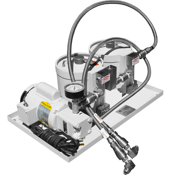 These NEW Leybold OF 1000 oil filtering systems are a dual canister model and are designed to remove acids and particulates from the lubricating fluid used in mechanical oil-sealed vacuum pumps. The OF 1000 oil filtering systems are located externally from the vacuum pump, and utilize their own integral gear pump in conjunction with a bypass to continuously recycle fluid through a filtering medium; the medium is housed in an element/canister assembly which additionally serves to absorb heat, and thus reduce the operating temperature of the vacuum pump. This is for hydrocarbon Oil filtering only. These units come new clean of oil and can be assigned to either PFPE (Fomblin or Krytox) or hydrocarbon service. These dual canister systems does not come with filter medium or any oil. Filter elements (Aluminum Oxide, Fullers Earth, Hydrophilic and Particulate) and vacuum oils are available on this website. These units can be operated on 1-Phase 115/208-220 VAC 50/60 Hz. A complete specifications and application brochure is available for download in PDF format below.
