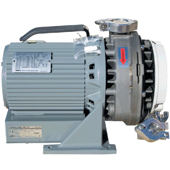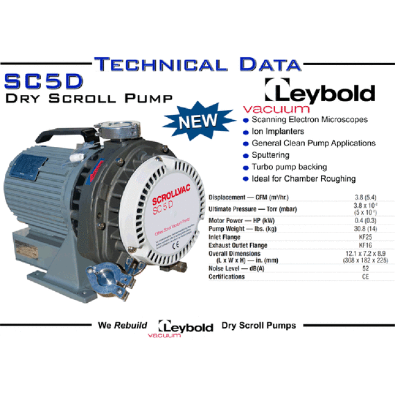 The Leybold SCROLLVAC SC series dry scroll vacuum pumps are available in 4 sizes: SC-5D, SC-15D, SC-30D, and SC-60D. The Leybold ScrollVac SC series dry scroll pumps have a large pumping speed for their size which ranges from 3.8 to 42 CFM. We offer a wide selection of optional accessories including HEPA filter inlet traps, exhaust silencers, and maintenance rebuild kits.