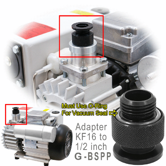 NOTE: The intake for this pump comes with a screw-on reduction flange, size 1/2 inch "G" BSPT Female, commonly used in Europe and Great Britain. With the reduction flange removed, the size becomes 3/4 inch "G" BSPT Female. An NW/KF 16 to 1/2 inch "G" BSPT adapter fitting is available on this website, Part Number P103760 (see middle picture above).