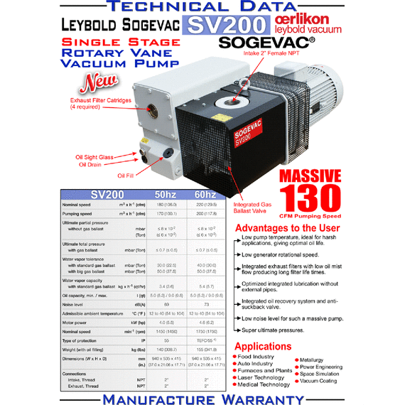 The New Leybold Sogevac SV200 SV 200 single stage oil sealed vacuum pump is designed for continuous operation over the working pressure range from atmosphere to less than 1 Torr. The Leybold Sogevac SV200 SV 200 consists of the pump body oil casing and drive cooling system. The Leybold Sogevac SV200 SV 200 has 4 built in exhaust filters, gas ballast valve, and an automatic oil return system. The Leybold Sogevac SV200 SV 200 is low noise, compact, low vibration, and easy to operate. This Leybold Sogevac SV200 SV 200 is also easy to maintain, service and repair. These Leybold Sogevac SV200 SV 200 vacuum pumps are used in a variety of industries such as packaging in the food preparation industry, degassing, thermal forming of plastics, vacuum drying, impregnation, leak testing, vacuum stirring and mixing. Pumping Speed 130 CFM. Maintenance service, repair, oils and accessories for these Leybold Sogevac SV200 SV 200 vacuum pumps are available on this website. This is a New Pump with factory warranty. We also service, repair and rebuild this Sogevac vacuum pump and perform maintenance repair on other Leybold Sogevac models as well. For Accessories for this pump see OPTIONAL ACCESSORIES below. The complete operating instruction manual can be downloaded below.
