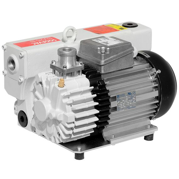 Sogevac pumps are oil sealed rotary vane pumps. Oil injected into the pump chamber for sealing, lubrication and cooling of the pump is recycled from the pump’s oil reservoir and filtered before it is injected. The lubricant system is rated for continuous operation at high intake pressures so that the pumps may be used in a versatile manner in most rough vacuum applications (accessories are required for some pumps).