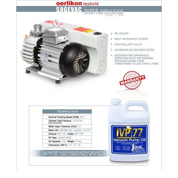 Leybold Sogevac SV25B Single Stage Rotary Vane Vacuum Pump, Worldwide Motor, PN: 960251