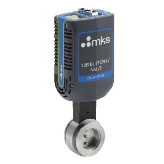 The T2BA is available in unique MKS low-conductance versions, enabling high-speed pressure control in atmospheric applications, including exhaust pressure control, CVD and RTP without a need for relying on O-Ring-based designs to minimize valve conductance. An encoder-based position feedback system is provided for diagnostic purposes. The valve is constructed of corrosion-resistant 316 stainless steel compatible with most process gases and is available in standard ISO flange styles with bore sizes from 1" to 4" (alternate sizes available on a custom basis). Standard seals offered are Viton®, alternate materials can be specified for compatibility with various process chemistries and/or heated applications.