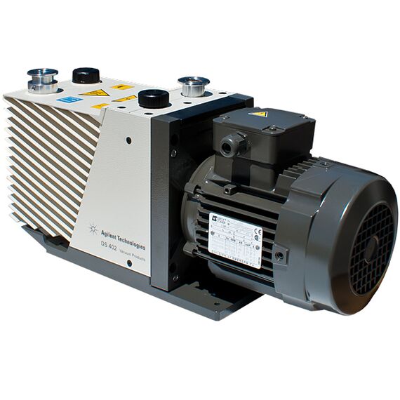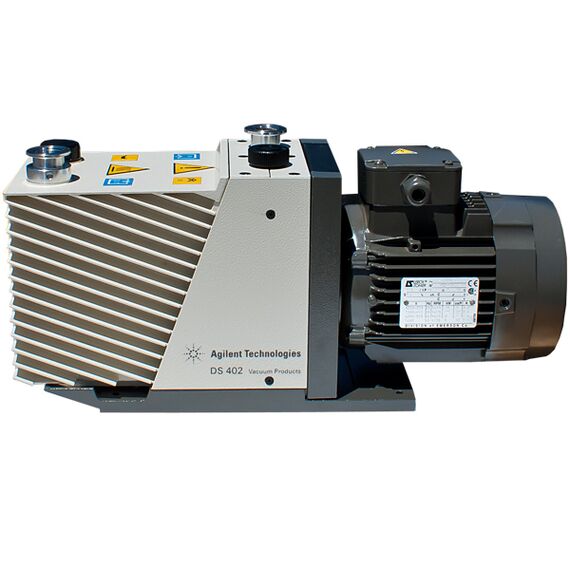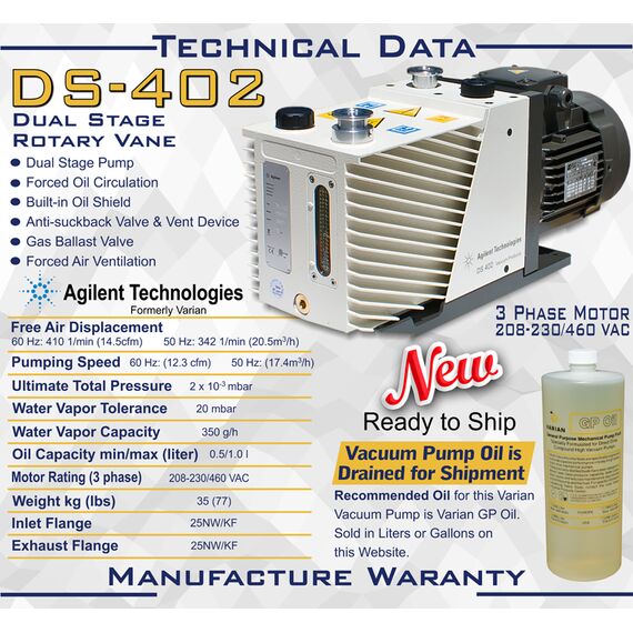 This NEW Agilent Varian DS402 DS 402 Dual Stage Rotary Vane Vacuum Pump is designed and manufactured to meet the demanding requirements of various industrial and scientific applications. Thanks to a very simple and highly reliable design, the Varian DS402 DS 402 dual stage rotary Vane vacuum pump provides great performance with high pumping stability. Used for light gases, they produce low noise with minimal oil backstreaming, and have a long operating life. These Varian DS402 DS 402 vacuum pumps have a pumping speed displacement of 12.3 CFM. This Varian DS402 DS 402 dual stage rotary vane vacuum pump is brand new and comes with a 3 phase 208-230/460 VAC motor. With the purchase price a manufacture warranty is included. Oil, parts and accessories for this pump are available on this website. For a Full Brochure and Instruction Manual on this pump, download the .pdf's below at AVAILABLE DOWNLOADS. We also offer rebuild and repair services for this pump and other Agilent Varian Products.