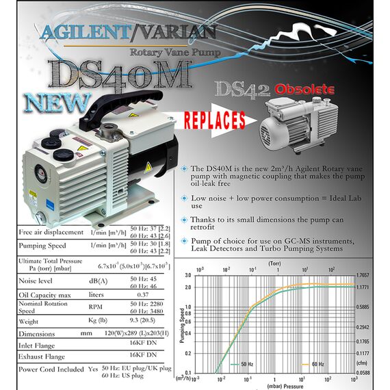 This is the new Agilent DS40 M with magnetic coupling. Thanks to its magnetic coupling the pump is virtually free from oil leaks. Designed to produce very low noise, the lowest of its size. This pump is perfect for in close lab work. Thanks to its small dimensions the pump can retrofit any competitor’s pump of the same size. The DS 40M is the pump of choice for use on GC-MS instruments, Leak Detectors and Turbo Pumping Systems. These Varian DS40M DS40 M vacuum pumps have a pumping speed displacement of 1.2 CFM. These Varian DS40M dual stage rotary vane vacuum pump (Agilent Part Number X3703-64000) are brand new. They have a 1-phase worldwide motor (100-120 VAC). With the purchase price a manufacture warranty is included. Oil, parts and accessories for this pump are available on this website. We also offer rebuild and repair services for this pump. The DS40M replaces the no longer available Agilent DS42.For complete specifications, See (AVAILABLE DOWNLOADS) below for PDF.