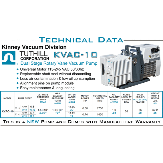 The NEW Kinney Tuthill KVAC-10 KVAC10 Dual Stage Rotary Vane Vacuum Pump is designed and manufactured to meet the demanding requirements of various industrial and scientific applications. Thanks to a very simple and highly reliable design, the NEW Kinney Tuthill KVAC-10 KVAC10 dual stage rotary vane vacuum pump provides great performance with high pumping stability. Used for light gases, they produce low noise with minimal oil backstreaming, and have a long operating life. These NEW Kinney Tuthill KVAC-10 KVAC10 vacuum pumps have a pumping speed displacement of 6.8 CFM. This NEW Kinney Tuthill KVAC-10 KVAC10 dual stage rotary vane vacuum pump is new and comes with manufacture warranty. Oil, parts and accessories for this pump are available on this website. We also offer rebuild and repair services for this and all Kinney Tuthill pumps.