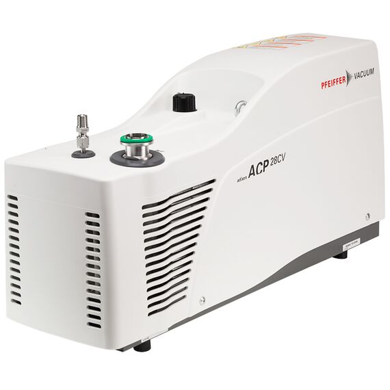 The vacuum pumping technology for these Pfeiffer Adixen ACP 28CV ACP28CV compact dry roughing vacuum pumps is based on a frictionless multi-stage roots design. These Pfeiffer Adixen ACP series pumps are optimized for operation without lubricants inside the pumping module. The benefits of multi-roots dry pumps include oil-free and particulate free dry vacuum, e.g., unlike their counterparts, the dry scroll pump which generate tipseal dust and the oil-sealed rotary vane pumps which suffer from hydrocarbon vapor backstreaming. The improved ACP dry vacuum pumps offer a reduced cost of ownership (COO) and require an overhaul only every 22,000 hours.