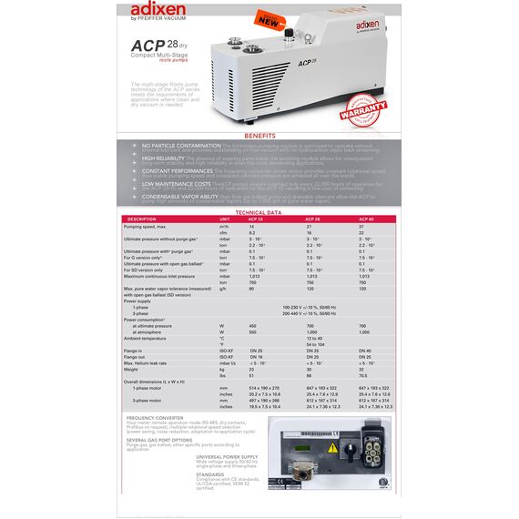 The specifications for the Alcatel Adixen ACP 28 ACP28 dry vacuum pump is a 16 cfm (27 m3/hr) pumping speed, 22.5 mTorr ultimate pressure, can operate on input voltages from 90 to 254 VAC 50-60 Hz, air cooled, includes integrated digital timer and manual gas ballast, and has a KF25 inlet & KF25 exhaust.