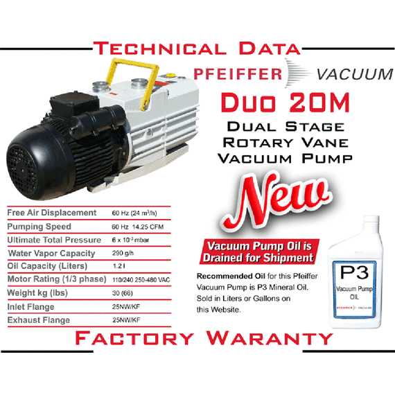 The Pfeiffer Balzers Duo 20M Dual Stage Rotary Vane Vacuum Pump New is designed and manufactured to meet the demanding requirements of various industrial and scientific applications. Thanks to a very simple and highly reliable design, the Pfeiffer Balzers Duo 20M dual stage rotary vane vacuum pump provides great performance with high pumping stability. This pump has a hydraulic safety valve for operational safety, gas ballast valve and integrated magnetic coupling to eliminate oil leaks. These Pfeiffer Balzers Duo 20M Dual Stage Rotary Vane Vacuum Pumps have a pumping speed displacement of 14.25 CFM. This Pfeiffer Balzers Duo 20M dual stage rotary vane vacuum pump comes with a 1 year factory warranty. Oil, parts and accessories for this pump are available on this website. We also offer rebuild and repair services for this pump, see below.