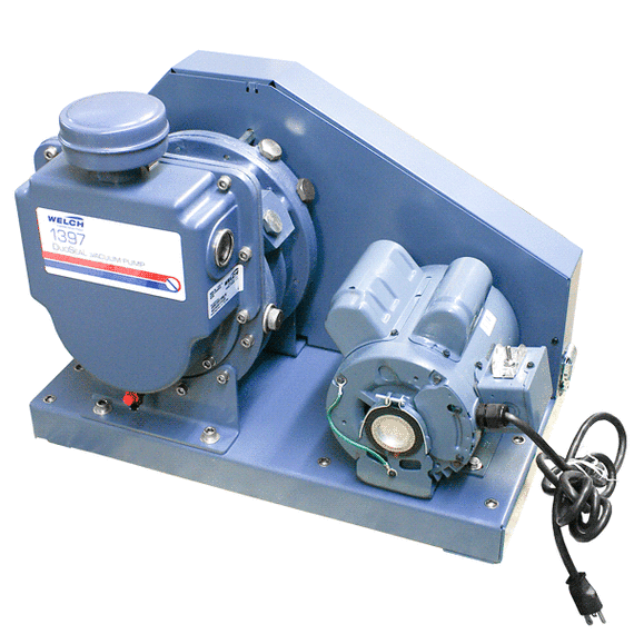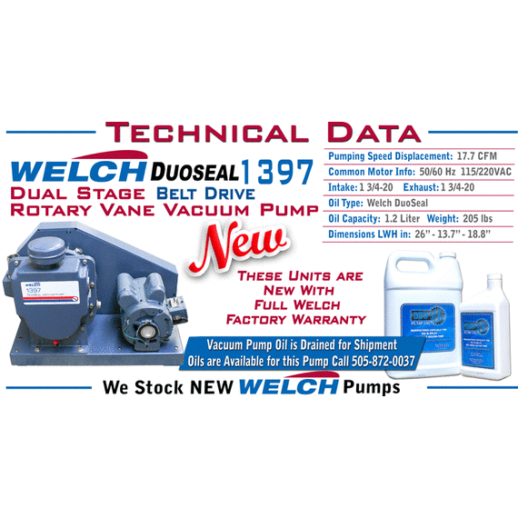 The New Welch 1397 DuoSeal Belt Drive Rotary Vane is a durable vacuum pump with a superior vapor handling capability. The Welch 1397 DuoSeal Belt Drive dual stage rotary vane mechanical vacuum pump offers an excellent ultimate pressure of 1x10-4 Torr. These pumps are commonly used for vacuum furnace evacuation, backing turbomolecular pumps, backing diffusion pumps, rotary evaporation, refrigeration system evacuation, epoxy degassing, vacuum sterilization, backing mass spectrometers, freeze drying, vacuum centrifugal applications, vacuum distillation, space research, and other vacuum processes. These Welch 1397 DuoSeal Belt Drive Pumps are New with full warranty and have a pumping speed displacement of 17 CFM, operate on 115 VAC, and are Brand NEW (product number 1397B-01). Please call to get discount information when purchasing multiple New Welch vacuum pumps.