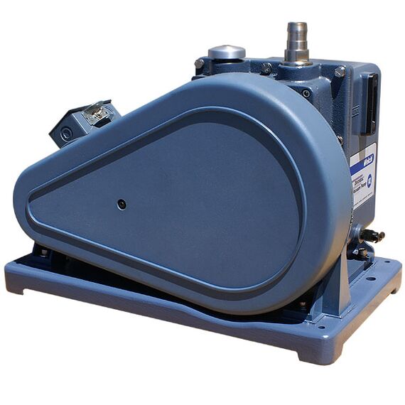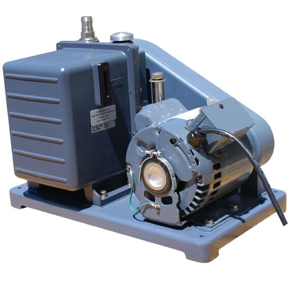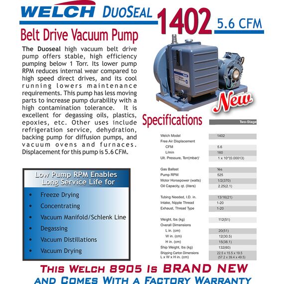 The Welch 1402 DuoSeal Belt Drive Rotary Vane is a durable vacuum pump with a superior vapor handling capability. The Welch 1402 DuoSeal Belt Drive dual stage rotary vane mechanical vacuum pump offers an excellent ultimate pressure of 1x10-4 Torr. These pumps are commonly used for vacuum furnace evacuation, backing turbomolecular pumps, backing diffusion pumps, rotary evaporation, refrigeration system evacuation, epoxy degassing, vacuum sterilization, backing mass spectrometers, freeze drying, vacuum centrifugal applications, vacuum distillation, space research, and other vacuum processes. These Welch 1402 DuoSeal Belt Drive Pumps have a pumping speed displacement of 5.6 CFM, operate on 115 VAC, and are Brand NEW (product number 1402B-01). Please call to get discount information when purchasing multiple New Welch vacuum pumps.