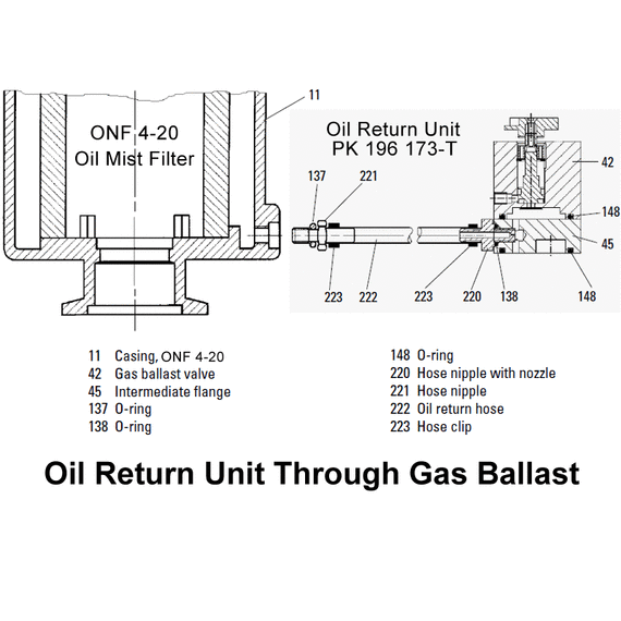 These Pfeiffer oil return units puts the oil mist droplets from the ONF 4-20 oil mist elminator back into the rotary vane pump via the gas ballast as a liquid. These products are recommended for Pfeiffer vacuum pump applications that often require cycling of the vacuum chamber to atmosphere. To learn how to install the oil return unit, download the .PDF below at AVAILABLE DOWNLOADS "See Section 3.2, Fitting oil return line".