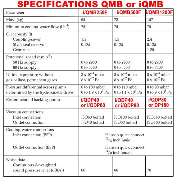 The QMB250F and QMB500F pumps are air-cooled and the QMB1200F pump is water-cooled. All the QMB pumps have enclosed, water-cooled motors and are therefore suitable for applications in clean environments where fan cooling is unacceptable. The pump coupling-cover is connected to the pump outlet and forms an integral part of the vacuum system. The connecting pipelines have a filter which removes debris and so prevents contamination of the lubricating oil and bearings. For an even cleaner system, the coupling-cover and bearings can be evacuated by connection to the pump-inlet or to an external vacuum pump.