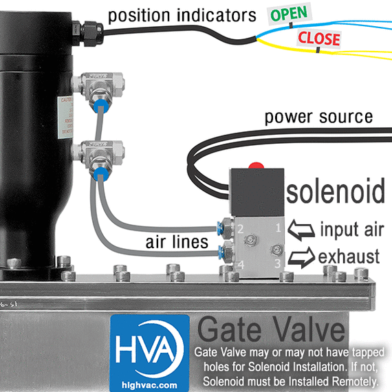 These solenoid assembly kits include solenoid, mounting bracket, air fittings, air line, air flow screws and manual override switch, requires 120 VAC. This 18-524M solenoid is used for pneumatic gate valves sold on this website. Input air pressure of 80 psig is required. No electrical power to the gate valve causes the gate valve to stay in the closed or locked position, reactivate electrical power and the gate valve opens. The solenoid also has a red manual override button on top of the solenoid. Push the red button shifts armature which actuates valves main stem. Release of manual force permits valve spring to return valve to normal position.