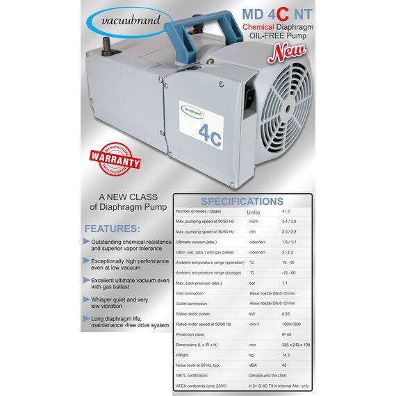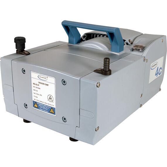 Vacuubrand MD 4C NT CHEMICAL Diaphragm Pump, CFM 2.2, Ultimate 1.1 Torr, 10mm barb inlet & outlet, 115 VAC, PN 20736403