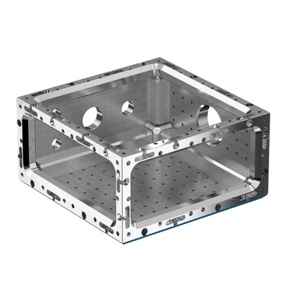 Our Vacuum Cube is a modular high-vacuum chamber system, conceived to enable creativity and design flexibility in vacuum chamber system construction. Cubes can be stacked together into various shapes and configurations, with interchangeable plates offering a variety of features for connections, windows, and feedthroughs. Plates include 1/4"-20 mounting threads on a standard 1" optical pattern for easy connection of hinges, posts, mounts, lenses, polarizers, and other accessories.