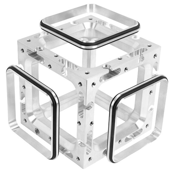 Vacuum Cubes can easily be stacked together to build a complex, yet lightweight vacuum system. The outer edges of each vacuum cube feature hardware mounting sockets for easy cube-to-cube connections. A cube coupling kit includes the hardware needed to connect two cubes together. This allows scientists to creatively construct long or odd-shaped vacuum systems in a laboratory.