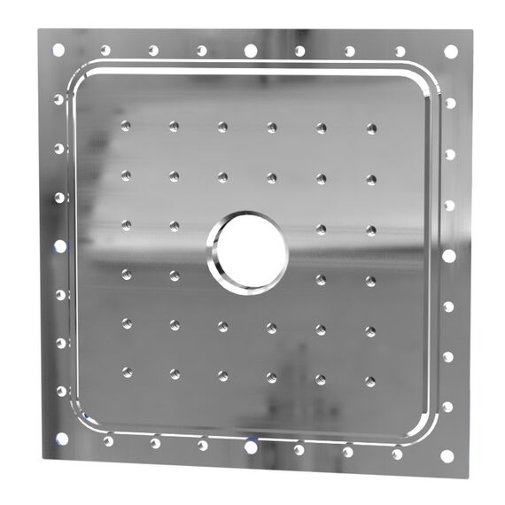 This Vacuum Cube 9x9 inch plate with one centered Conflat CF 3.375 inches (CF 3-3/8) pumping/feedthrough port is designed to fit our 9x9x9 vacuum cubes (each cube requires 6 plates). This plate's Conflat port requires eight (8) 5/16-24 x 1.0" long, silver-plated, 12 point bolts (our part number: P1012250). These conflat ported plates are built with our patented taper seal technology which incorporates sloped sealing features to help prevent damage to the vacuum sealing surfaces. These Vacuum Cube plates are CNC milled from a single block of 6061-T6 Aluminum Alloy. This is the sale of a Vacuum Cube 9x9 inch with one CF 3.375 in. port only (other plates, frame, and hardware are required and sold separately).
